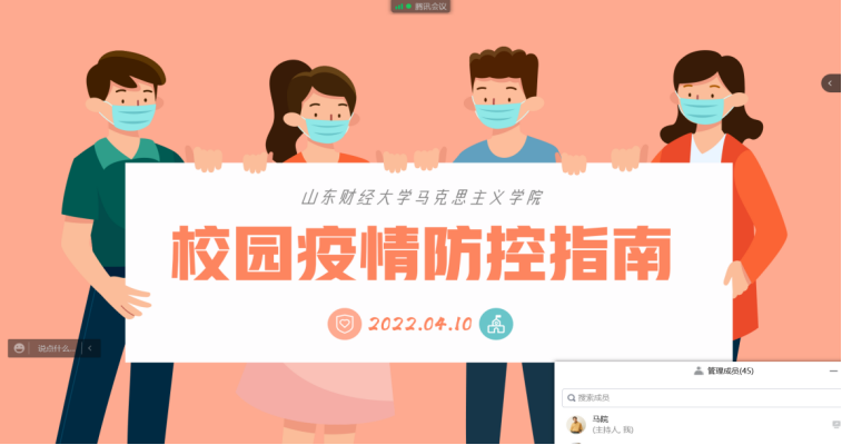 为贯彻落实学校关于疫情防控工作的部署和要求,进一步做好新冠疫情防控工作,积极响应防疫号召,加强防疫教育,提高同学们的防范意识,4月10日,按照学院党委的统一安排,肉漫屋 通过腾讯会议线上组织开展了疫情防控主题班会,学院党委副书记王恩娟、辅导员高小燕参加了此次班会,班会由辅导员高小燕主持。