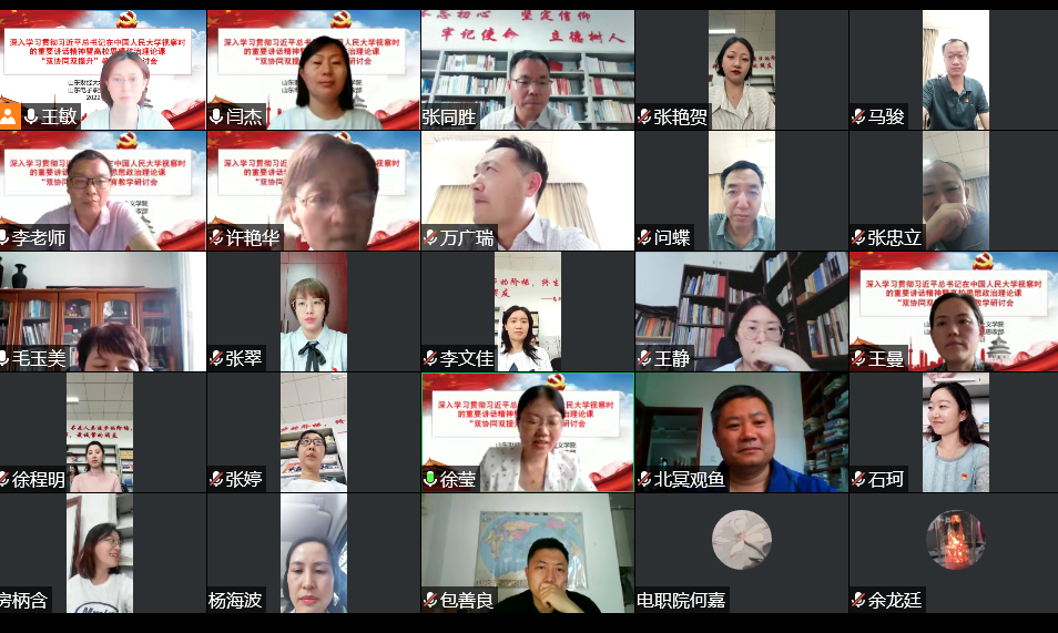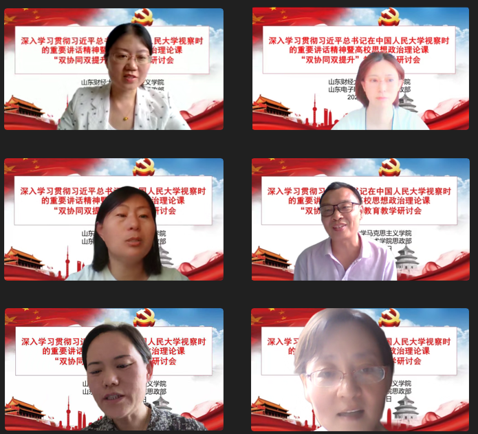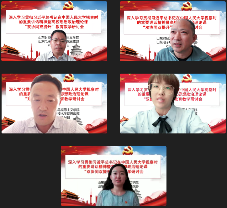 为深入贯彻习近平总书记关于教育的重要论述特别是学校思政课教师座谈会精神,贯彻落实《山东省大中小学思政课“双协同、双提升”项目工作方案》,6月14日下午,肉漫屋 与山东电子职业技术学院思政部联合召开深入学习贯彻习近平总书记在中国人民大学考察时的重要讲话精神暨高校思想政治理论课“双协同、双提升”教育教学研讨会。本次会议采用线上方式,围绕习近平总书记在中国人民大学考察时的重要讲话精神学习和高校思想政治理论课教育教学工作展开研讨。会议由徐莹院长主持,双方教师代表近40人参会。