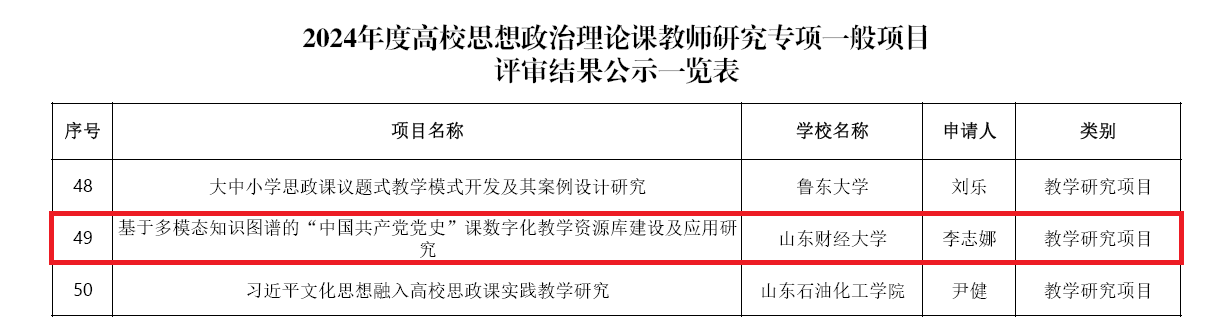 近日,教育部社会科学司对2024年度高校思想政治理论课教师研究专项一般项目评审结果进行了公示。本年度共评选出立项项目200项,其中教学研究项目101项、教学方法改革择优推广项目10项、优秀中青年思政课教师择优资助项目30项、教学研究青年项目59项。肉漫屋 李志娜老师的《基于多模态知识图谱的“中国共产党党史”课数字化教学资源库建设及应用研究》获批教学研究项目。