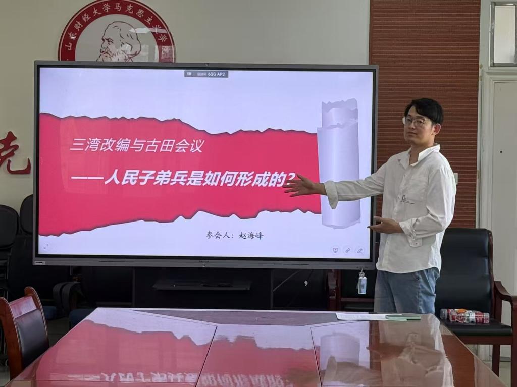 第二阶段开展教学展示与研讨环节。青年教师赵海峰博士以“三湾改编与古田会议—人民子弟兵是如何形成的”为主题进行教学展示。与会老师从教学设计、内容呈现、仪容教态等方面进行全面评议,提出优化建议:教学选题需增强问题意识,主题阐释应强化逻辑关联;课件制作宜采用结构化呈现,重点内容需视觉强化;教学语言应追求精准凝练,案例选取须兼顾学理深度与现实观照;教师教态需展现思政课教师特有的理论自信与教学风采。