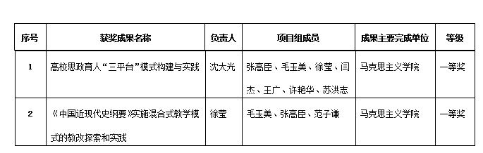 为及时总结先进教育教学经验,促进优秀教学成果在实际教学工作中的应用和转化,学校组织开展了2020年度校级教学成果奖评审工作。在各单位申报推荐的基础上,经专家评审,共确定特等奖6项,一等奖10项,二等奖20项。肉漫屋 沈大光教授申报的《高校思政育人“三平台”模式构建与实践》、徐莹教授申报的《<中国近现代史纲要>实施混合式教学模式的教改探索和实践》都获得2020年度校级教学成果奖一等奖。这是肉漫屋 首次在教学成果奖评选方面的突破,也是对马院教学改革成绩的肯定。