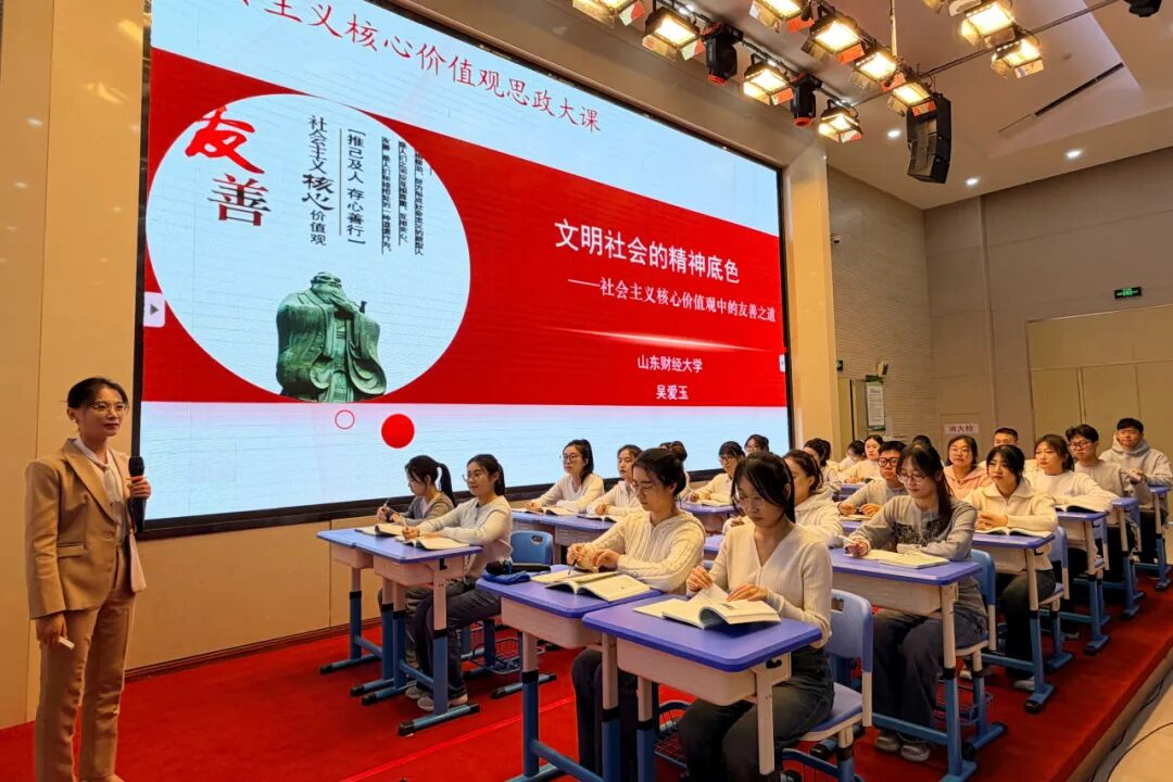 教学展示环节,山东财经大学马克思主义学院吴爱玉、省实验中学德润校区张潇涵、砚泉学校郭丽、盛景小学徐涵杨作为大中小教师代表进行课堂授课,按照“小学感性认知—初中实践探究—高中价值升华—大学理论深化”的逻辑设计,呈现了“友善”主题在不同成长阶段的丰富意涵。